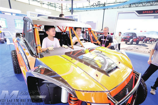 9月28日,在第十三屆中國(guó)(綿陽)科博會(huì)上,小觀眾體驗(yàn)全地形越野車。