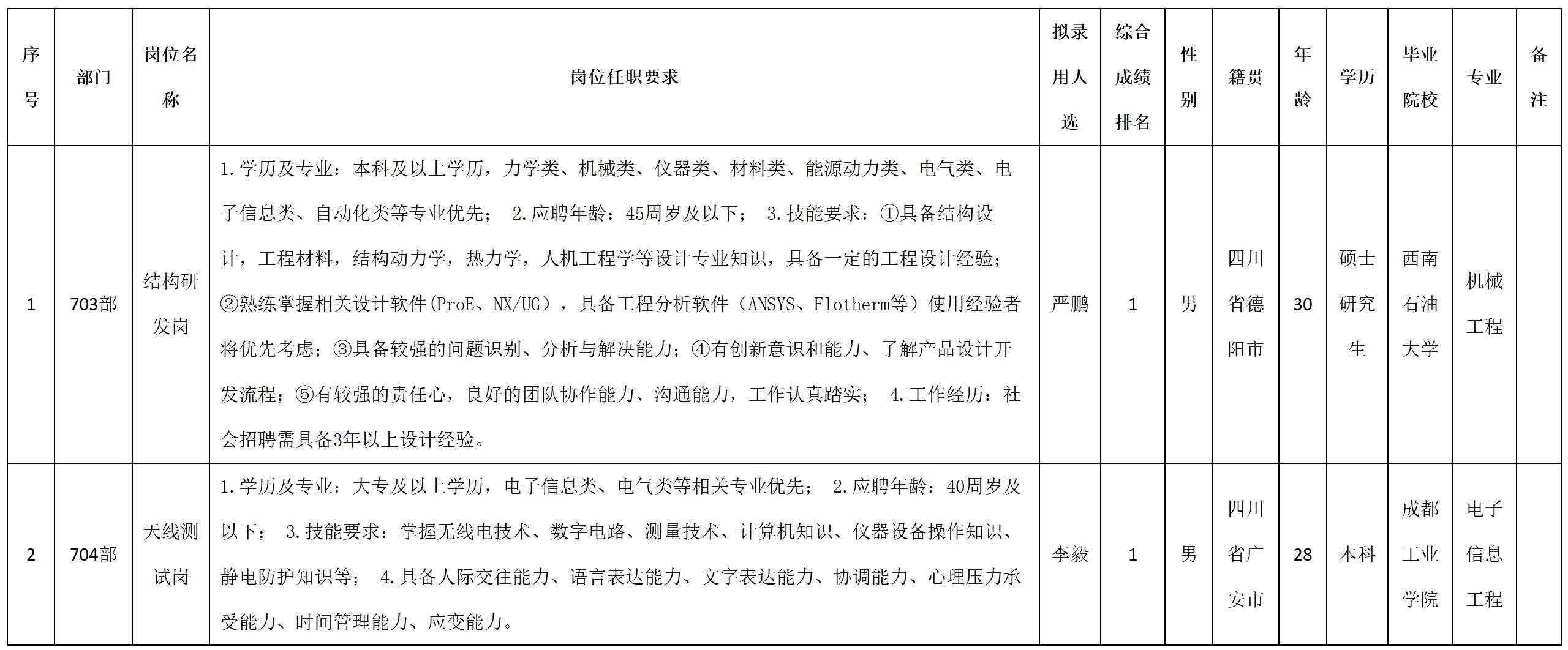 根據(jù)四川九洲電器集團有限責任公司發(fā)布的招聘公告及招聘相關規(guī)定,經(jīng)筆試、面試、考察、體檢等程序,擬錄用嚴鵬等2名同志到四川九洲電器集團有限責任公司工作,現(xiàn)予以公示,具體情況如下: