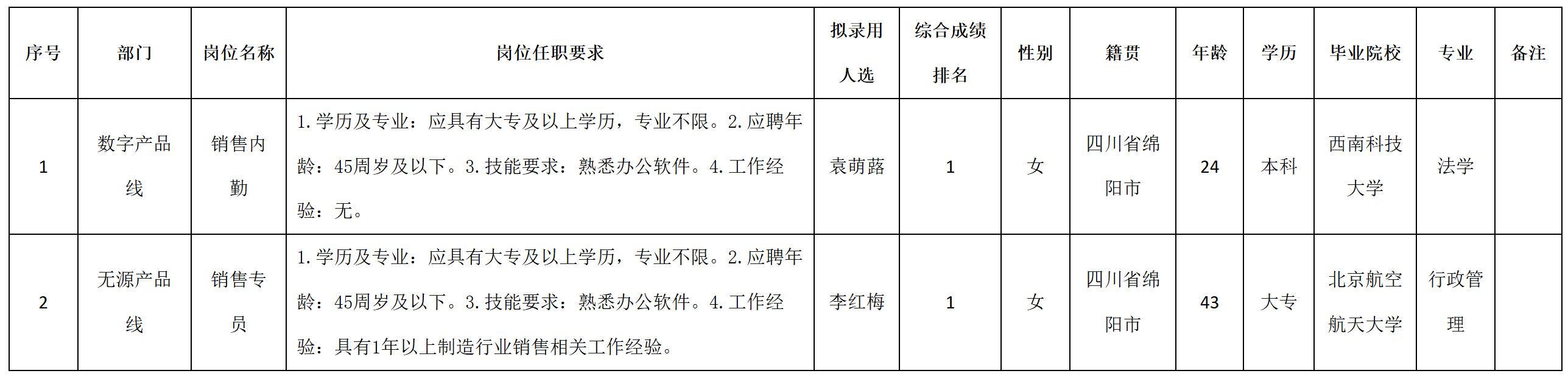 根據(jù)四川九州光電子技術(shù)有限公司發(fā)布的招聘公告及招聘相關(guān)規(guī)定,經(jīng)測(cè)試、考察、體檢等程序,擬錄用袁萌蕗等2名同志到四川九州光電子技術(shù)有限公司工作,現(xiàn)予以公示,具體情況如下: