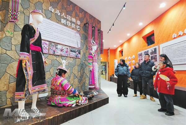 改造過程中,老建筑的磚瓦肌理、時代標語與空間格局被精心保留,將白馬花腰帶、羌繡精美紋樣、植物染素雅藍布、木雕面具靈動神態(tài)悄然融入其中,一座“會呼吸”的非遺活態(tài)博物館就此誕生。