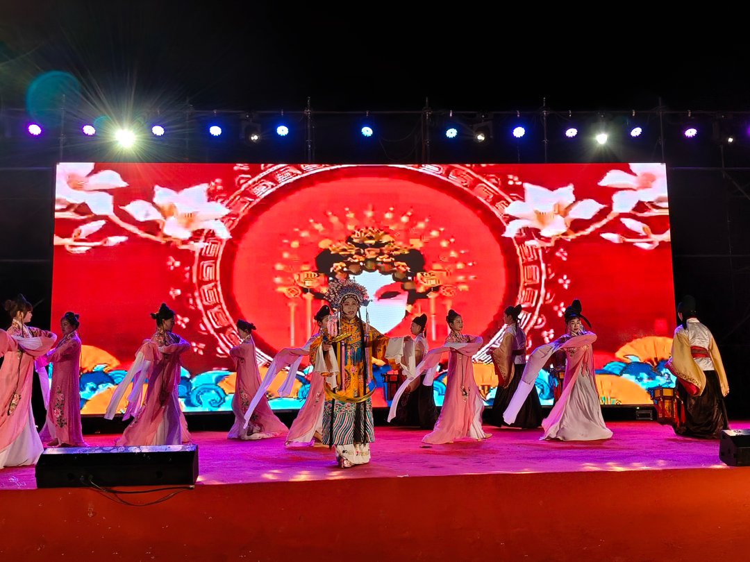 裝飾著彩燈與鄉(xiāng)土元素的廣場(chǎng)中央,開(kāi)場(chǎng)舞《馭馬踏春來(lái)》拉開(kāi)了晚會(huì)的序幕。舞臺(tái)雖然簡(jiǎn)單,但村民們的熱情絲毫不減。歌曲《我們都是鹽亭人》《恭喜發(fā)財(cái)》唱出了紅火日子,舞獅、情景舞蹈、京劇、魔術(shù)、非遺雜耍等節(jié)目輪番登場(chǎng)。