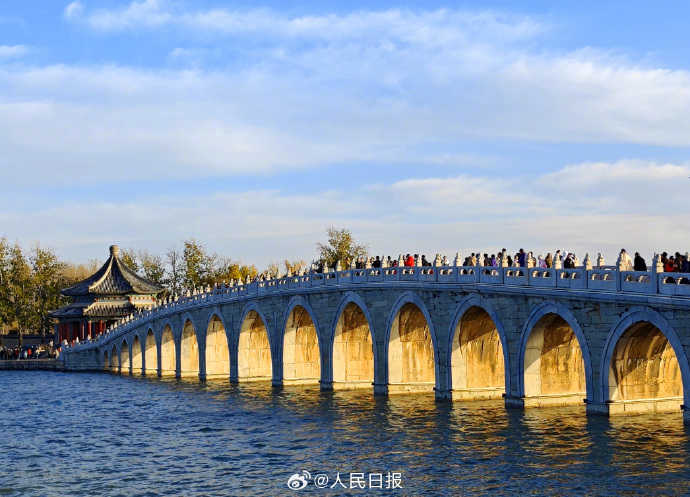 11月16日,北京,頤和園十七孔橋再現(xiàn)“金光穿洞”景致,美不勝收,吸引游客打卡觀賞拍照。 [