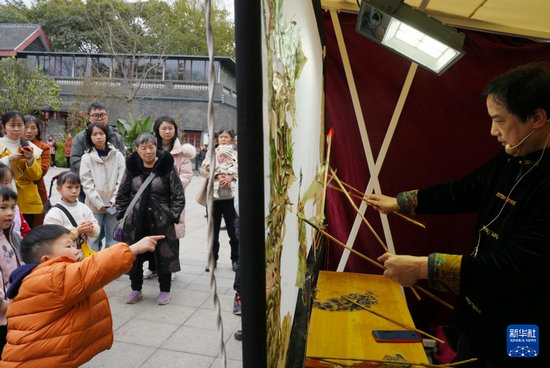 3月15日,在四川省成都市青白江區(qū)城廂鎮(zhèn)家珍公園,成都市非遺項(xiàng)目皮影戲代表性傳承人周軍為市民表演皮影戲。 為做好各級(jí)非遺項(xiàng)目的傳承與保護(hù),家珍公園每個(gè)周末都會(huì)邀請(qǐng)非遺傳承人現(xiàn)場(chǎng)展演非遺項(xiàng)目,并與市民交流互動(dòng)。[
