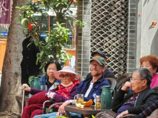 陽光透過樹葉的縫隙,帶來絲絲熱氣。不斷有戲迷前來,他們熱情地與葛安喬打招呼,“美國朋友,歡迎你來看川劇”。葛安喬用滿臉的微笑回應(yīng),并送上一句,“你好”。 [