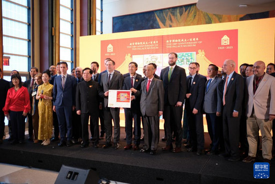 5月19日,在位于紐約的聯(lián)合國(guó)總部,嘉賓展示“故宮博物院成立100周年”特別事件郵票版張。 “生生不息——故宮文創(chuàng)走進(jìn)聯(lián)合國(guó)主題展”開幕式暨故宮博物院成立100周年郵票發(fā)布儀式19日在聯(lián)合國(guó)總部舉行,120余位各國(guó)駐聯(lián)合國(guó)大使及國(guó)際組織代表參加。[