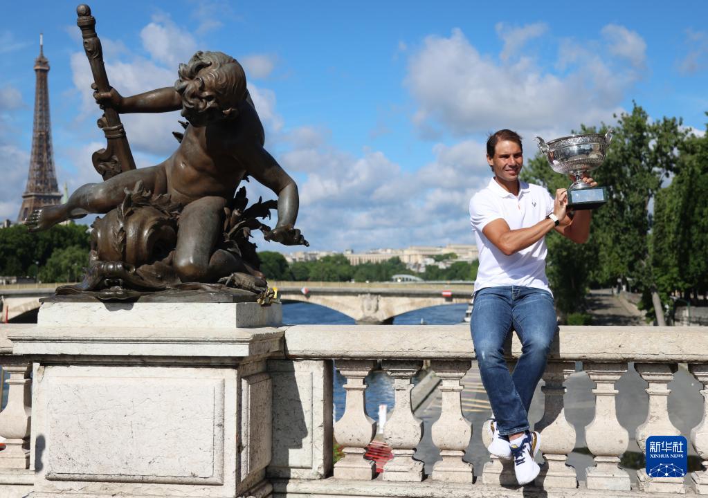 6月6日,納達(dá)爾手扶獎(jiǎng)杯在巴黎亞歷山大三世橋合影留念。[