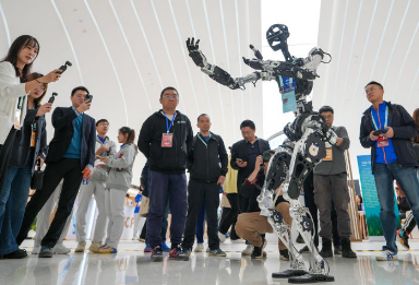 在2025中關(guān)村論壇年會上,人形機器人“夸父”每天都很忙。它承擔著迎賓工作,為公眾解答疑問、提供講解和指引服務(wù)等,碰到不認路的情況也能自如帶路。 [