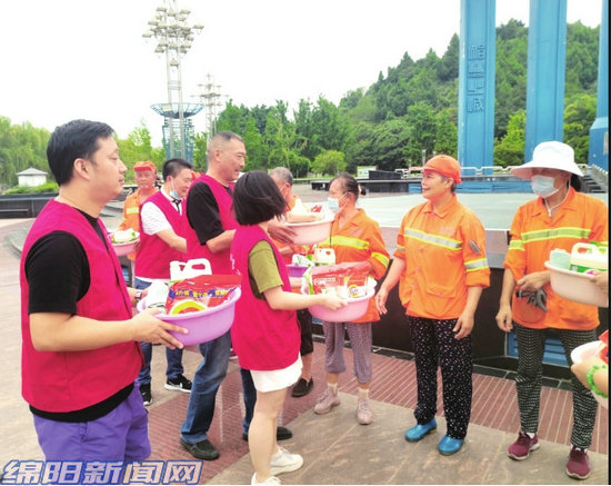 8月4日上午,正在科學家公園忙碌的邱安素、郭召平等環(huán)衛(wèi)工人,收到了綿陽市非遺中心志愿者服務(wù)隊送來的防暑藥、生活用品等慰問品。 [