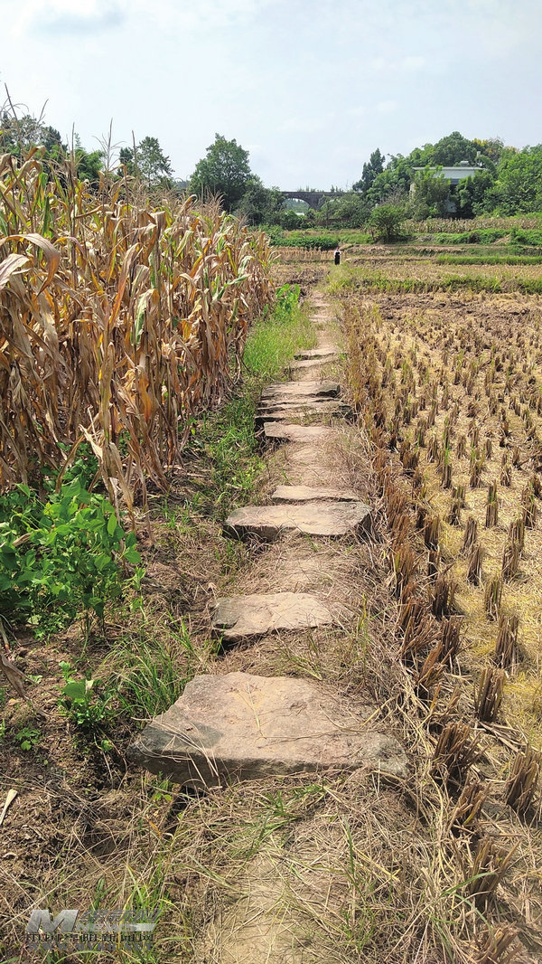 趙家花園村九社一段古道上還殘存有部分石板 古蜀道自新鋪向北,一路沿山脊前行,其間大部分道路已經(jīng)硬化成了混凝土道路,少部分仍然裸露著泥土,寬度無法容納汽車。經(jīng)過石廟子后,右拐下山,不遠(yuǎn)就來到了新皂鎮(zhèn)。 新皂鎮(zhèn)在古時候曾經(jīng)名為鐘陽鎮(zhèn),由于.. [