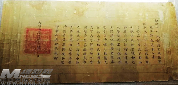 三臺(tái)縣博物館珍藏著一道明朝萬歷年間的圣旨,它是明朝第十三位皇帝明神宗朱翊鈞于萬歷四十四年(1616年)命御馬監(jiān)太監(jiān)葉忠到云臺(tái)觀頒施道教《大藏經(jīng)》時(shí)發(fā)的敕諭,距今已400余年。 [
