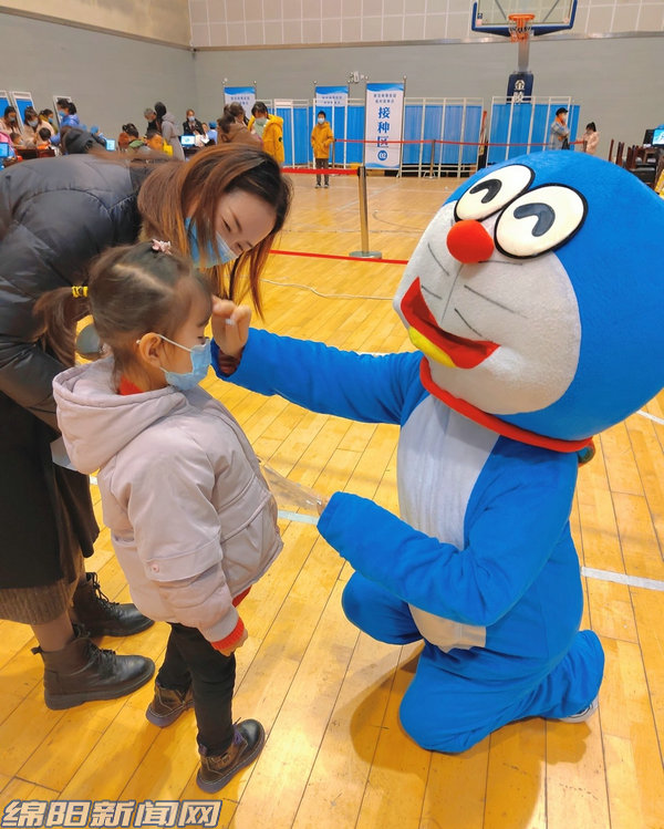 11月20日一大早,位于安州區(qū)體育館的新冠疫苗臨時(shí)接種點(diǎn)內(nèi),不少家長(zhǎng)帶著孩子前來(lái)接種疫苗。場(chǎng)館內(nèi),一只憨態(tài)可掬、呆萌無(wú)比的“機(jī)器貓”卡通人物,吸引了孩子們的注意。 [