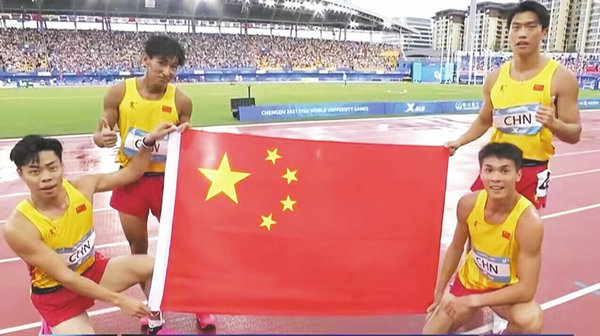 中國(guó)隊(duì)?wèi)c祝勝利,右上為鄧智艦。 綿陽(yáng)新聞網(wǎng)訊 8月6日,成都第31屆世界大學(xué)生夏季運(yùn)動(dòng)會(huì)田徑項(xiàng)目男子4×100米接力決賽在成都雙流體育中心體育場(chǎng)舉行。最終,由綿陽(yáng)選手鄧智艦等組成的中國(guó)隊(duì)以38秒80的成績(jī)獲得冠軍。 接力比賽,無(wú)疑是田.. [