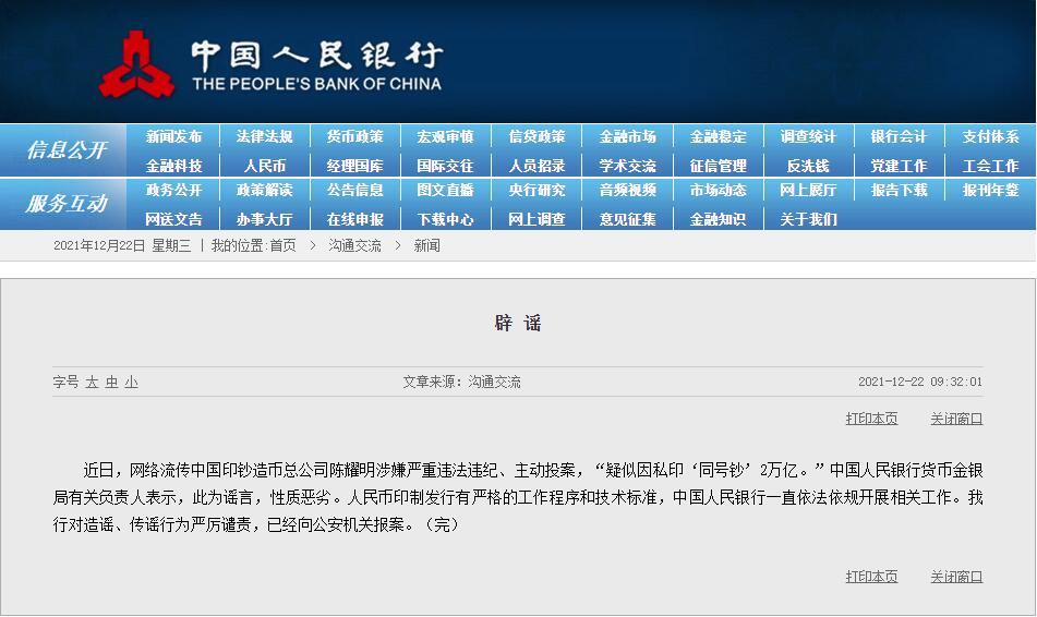 近日,網(wǎng)絡(luò)流傳中國(guó)印鈔造幣總公司陳耀明涉嫌嚴(yán)重違法違紀(jì)、主動(dòng)投案,“疑似因私印‘同號(hào)鈔’2萬(wàn)億。”中國(guó)人民銀行貨幣金銀局有關(guān)負(fù)責(zé)人表示,此為謠言,性質(zhì)惡劣。人民幣印制發(fā)行有嚴(yán)格的工作程序和技術(shù)標(biāo)準(zhǔn),中國(guó)人民銀行一直依法依規(guī)開(kāi)展相關(guān).. [