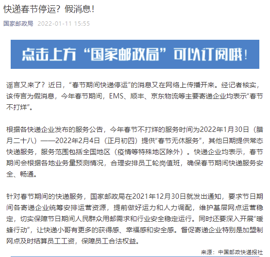 快遞春節(jié)停運(yùn)? 國(guó)家郵政局辟謠:假消息