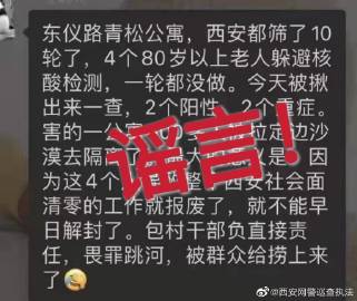 #聯(lián)合辟謠##微博辟謠# 【#西安辟謠800多人被拉定邊沙漠去隔離# 】據(jù)“西安網(wǎng)警巡查執(zhí)法”微博1月9日凌晨消息,1月8日,西安本地微信群中傳播的一條信息稱(chēng),“東儀路青松公寓,4個(gè)80歲以上老人躲避核酸檢測(cè),導(dǎo)致一公寓800多人被拉定邊沙漠隔離,并稱(chēng)包.. [