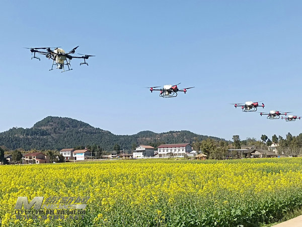 最近幾天,天氣晴好,梓潼縣的植保無人機“飛手”操作九架植保“小飛機”飛翔在田間地頭,給油菜大田打藥,防治病蟲害及補硼作業(yè)。 [